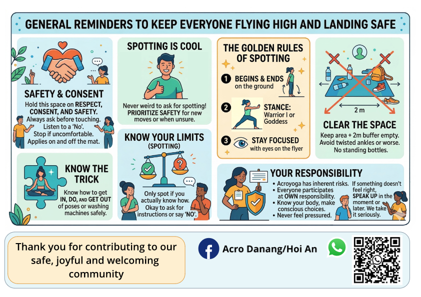 Although we so everything to minimize them, acroyoga is a physical practice with inherent risks. Everyone participates at their own responsibility. By joining, you acknowledge these risks and agree that fellow practitioners (or organizers, if any) cannot be held responsible for any injuries, damages, or costs that may arise. Know your body, make conscious choices, and never feel pressured into anything beyond your comfort or ability level.