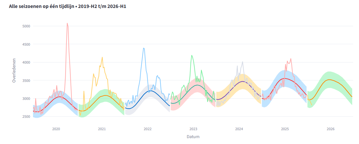 Je ziet dat die van 2025 (groen) sneller stijgt dan die van 2026 (rood) en daardoor hoger uitkomt. En waarom zijn die golven zoals ze zijn? Kwestie van het passend maken, zoals hierboven beschreven. De daling in de verwachte sterfte voor 2026 komt dus niet door een geheimzinnige agenda, maar door de manier waarop het algoritme de data selecteert en de waardes in de formule zo passend mogelijk maakt.